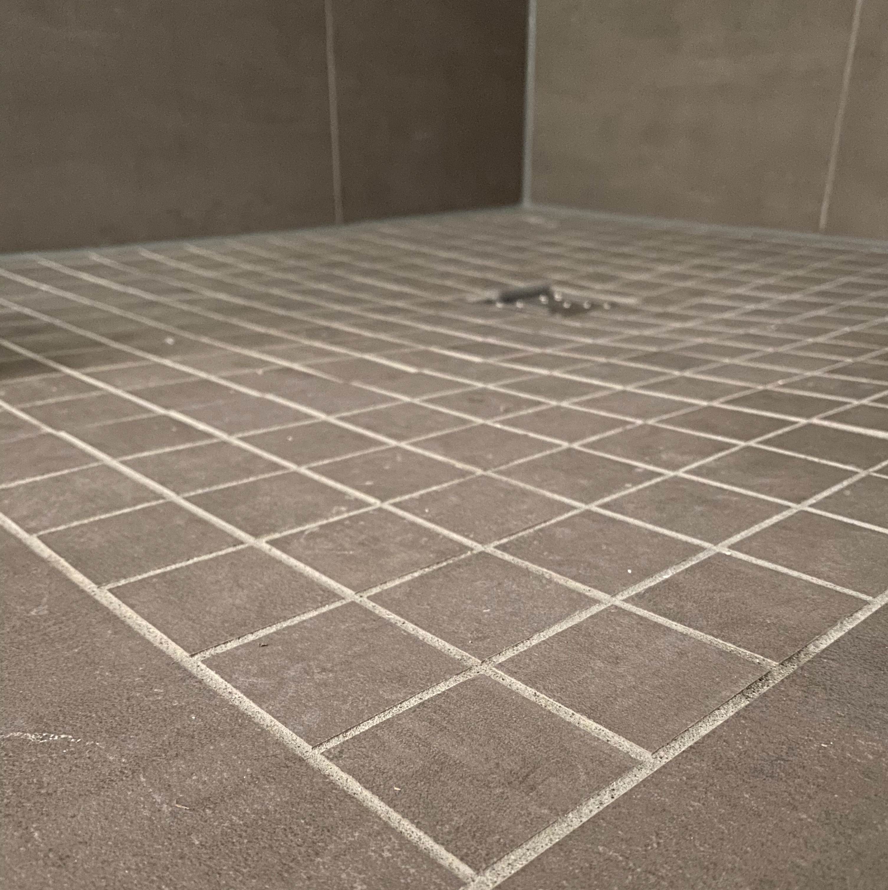 Die bodengleich gefliesten Duschböden mit punktuellem Bodenablauf und einem entsprechenden Fliesengefälle zieren (in diesem Beispiel der Musterwohnung) Mittelmosaikfliesen.